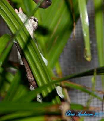 To start with, chameleons are generally solitary animals that are considered shy by nature. While members of the genera Brookesia, Rhampholeon and Rieppeleon are known to be quite accepting of members of their own species, most typical chameleons are intolerant of cohabitation with the exception of during mating and courtship. (See article, Cohabitation) Understanding that chameleons are shy by nature can help improve care techniques. For one thing, from this it is clear that chameleons generally do not do well with high activity levels in the vicinity of their immediate environment. Similarly, they do not appreciate frequent interaction with their keeper and often react poorly to frequent handling or unneeded observation. Chameleons often lean around branches to try to hide from disturbances. These types of situations are highly stressful for chameleons.